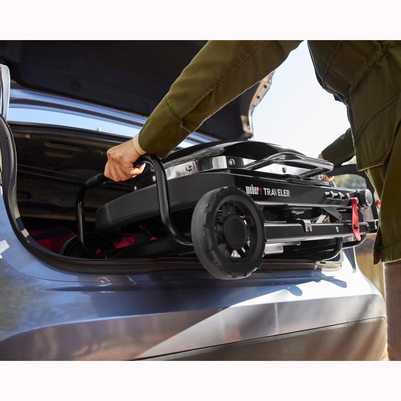 • Make grilling part of your next outdoor adventure with the Weber Traveler Compact Portable Gas Grill. At 32″ wide and only 39 pounds, it’s 20% smaller than the original Weber Traveler Grill and fits easily into the trunk of most compact cars. Sturdy one-piece design with automatic lid lock makes it easy to take anywhere, from the trail to a tailgate. Raise the grill with one hand and get cooking, with plenty of room to make a meal for four.